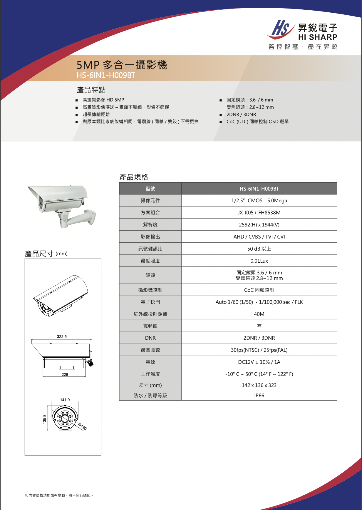 HS-6IN1-H009BT 昇銳 5MP 戶外 槍型攝影機