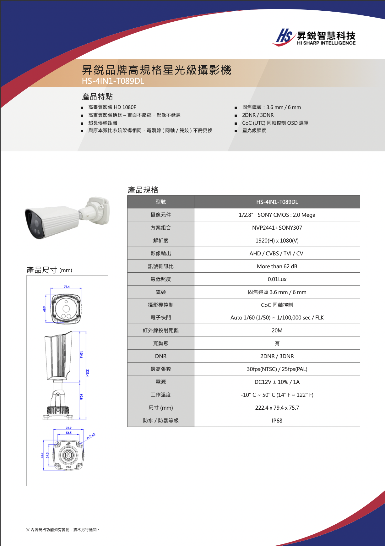 昇銳 HS-4IN1-T089DL 2MP 星光級槍型類比攝影機