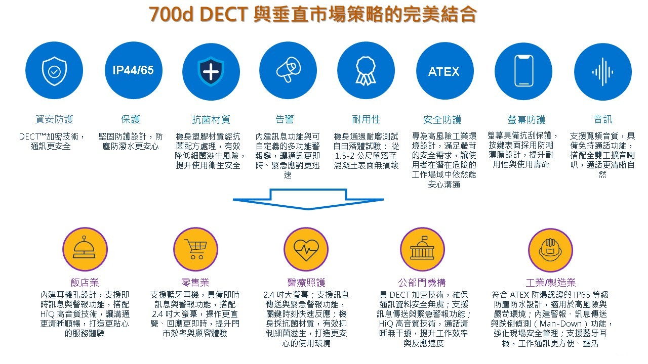 | 打造安全高效的行動辦公環境 700d DECT 系列結合高效能、可擴充的分散式架構,與您現有的 Mitel 統一通訊系統與應用程式完美整合,提供穩定、安全的無線通訊體驗。專屬的頻段設計可有效避免干擾,並讓您隨時存取企業電話簿、即時訊息與緊急警報。 手機支援訊息優先權顯示、彩色畫面提示不同等級、互動式訊息功能,以及可自定義的快速回應鍵,協助員工在關鍵時刻快速應對,全面打造更安全的工作環境。 |