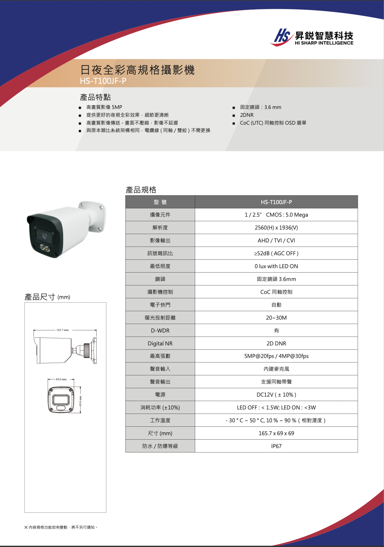 昇銳 HS-T100JF-P 5MP 暖光全彩槍型攝影機
